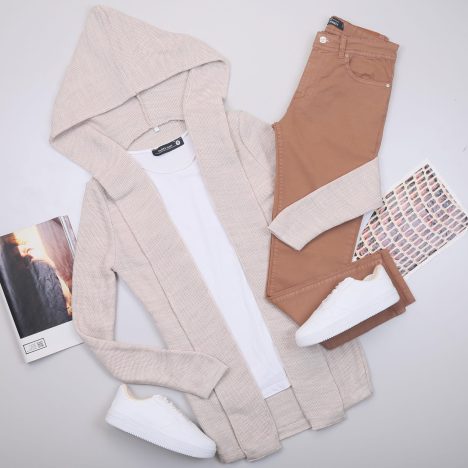 کفش. شلوار. تی شرت. ژاکت کش باف پشمی کلاهدار بژ
