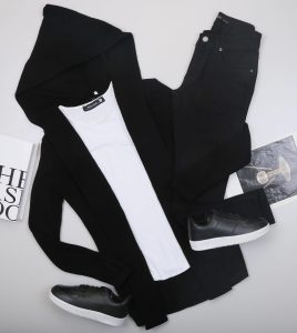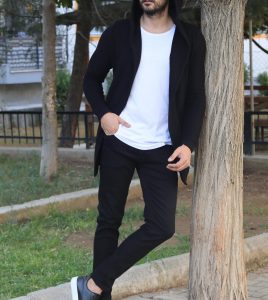 کفش. شلوار. تی شرت. ژاکت کش باف پشمی کلاهدار مشکی