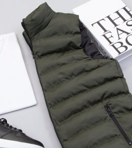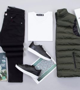 جلیقه پف دار خاکی، شلوار. تیشرت.کفش